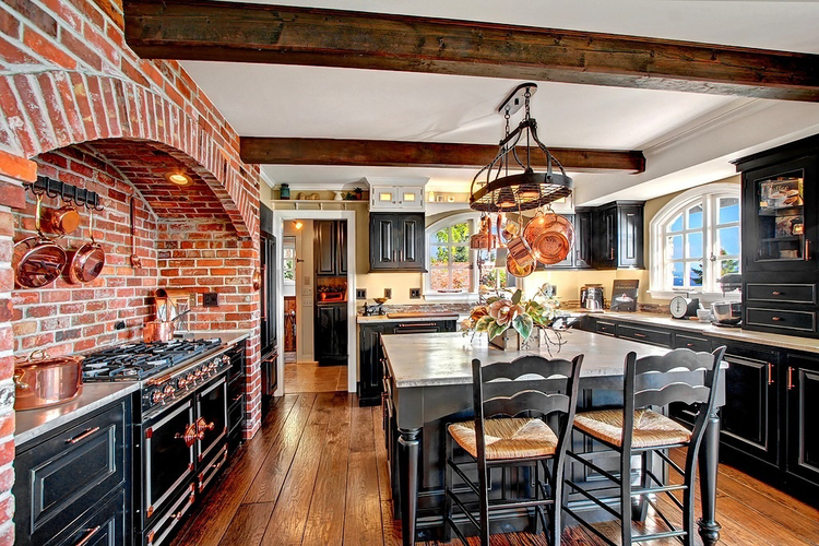 A rustic kitchen is for those whom truly enjoy cooking and entertaining. A list of must elements will create your rustic kitchen design: brick, wood backdrops, wood exposed beams, colored appliances, arches in the design, vintage-style cabinets., wood countertops, fireboxes, antique brass or copper faucet., exposed hanging pots.